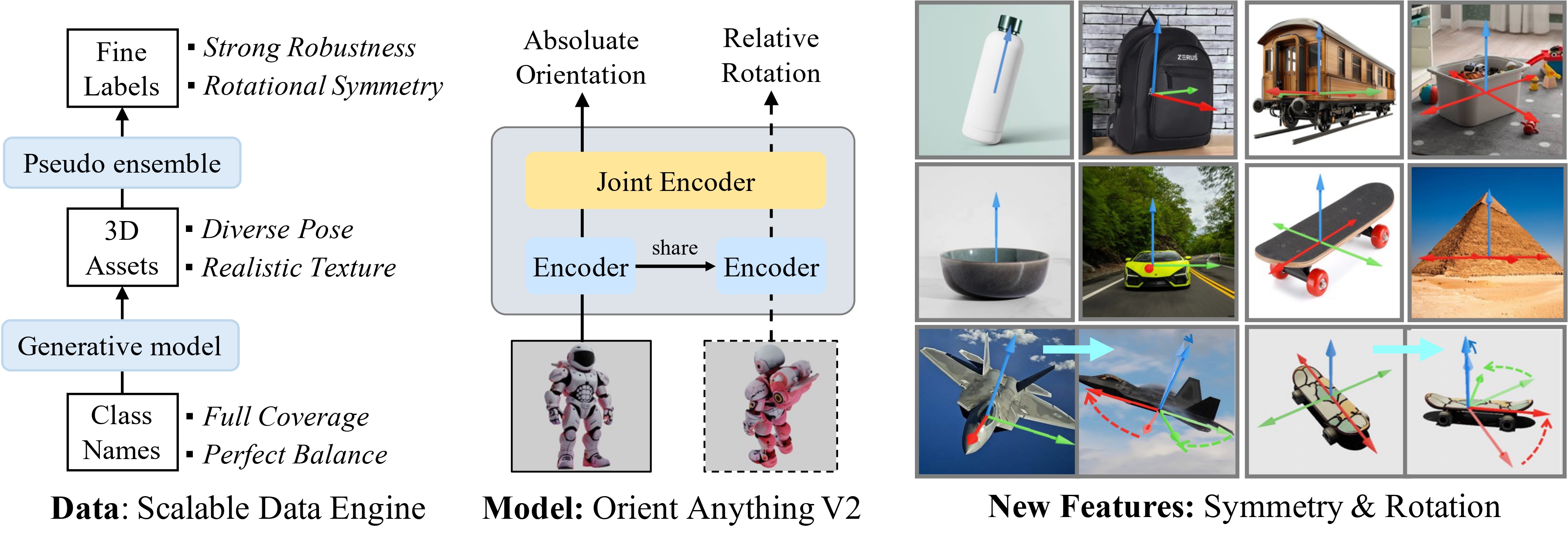 Orient Anything V2, a unified spatial vision model for understanding orientation, symmetry, and relative rotation, achieves SOTA performance across 14 datasets. For visualization, the object orientation is represented by the red axis, while the blue and green axes indicate the upward and left sides of the object.